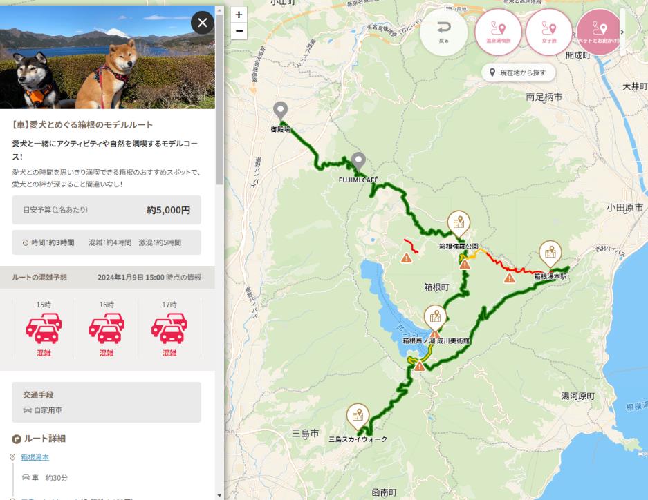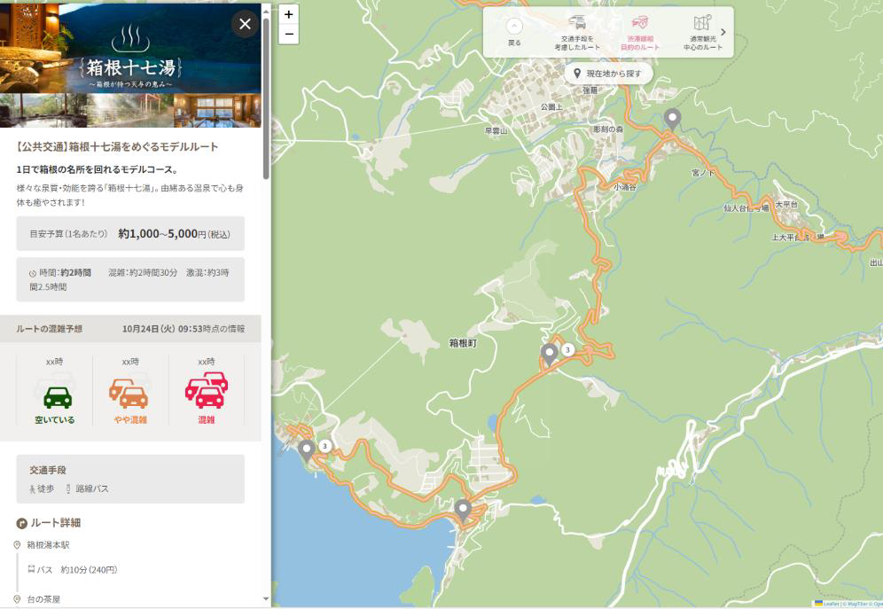 観光テーマや周遊地域を中心としたおすすめルートの紹介だけでなく、需要の分散化・平準化を目的としたタイムシフト観光(早朝・夜間)ルートの提案や、交通手段を考慮し、渋滞情報を加味したルートの提案などにより、スムーズな箱根観光をサポートします。