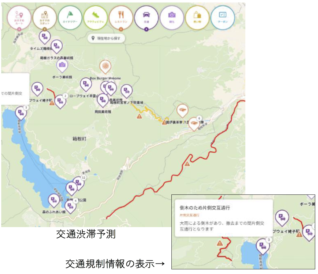 箱根町内の6 ヵ所の駐車場混雑状況をデータ取得し、デジ タルマップ上に混雑・交通情報を表示することで、車利用の 観光をサポートします。
