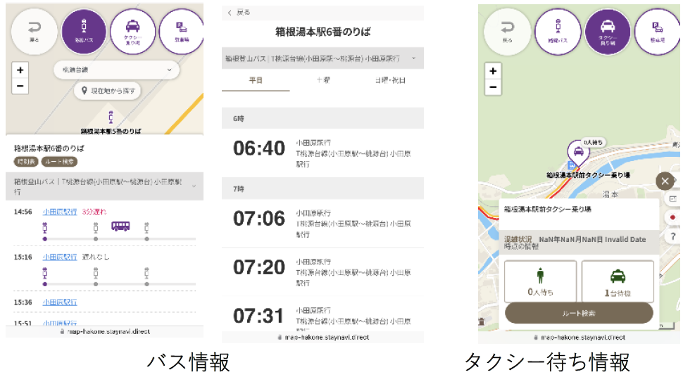 タクシー乗り場(強羅駅・箱根湯本駅)での待ち人数データ とともに、スマートフォンやPC で交通状況が確認できる ため、最適な交通手段の選択や、渋滞を避けた、時間を有 効活用した観光周遊が可能となります。