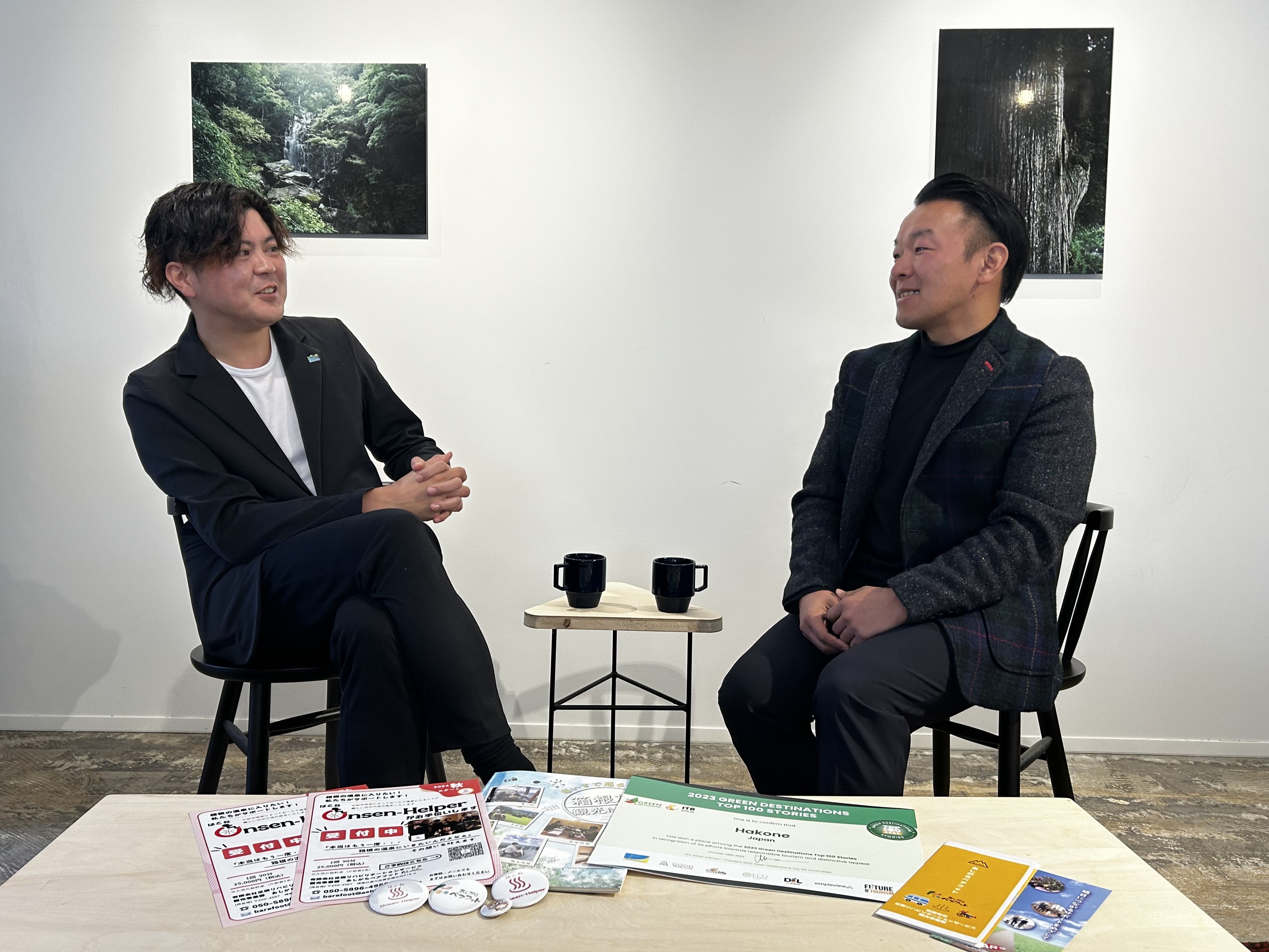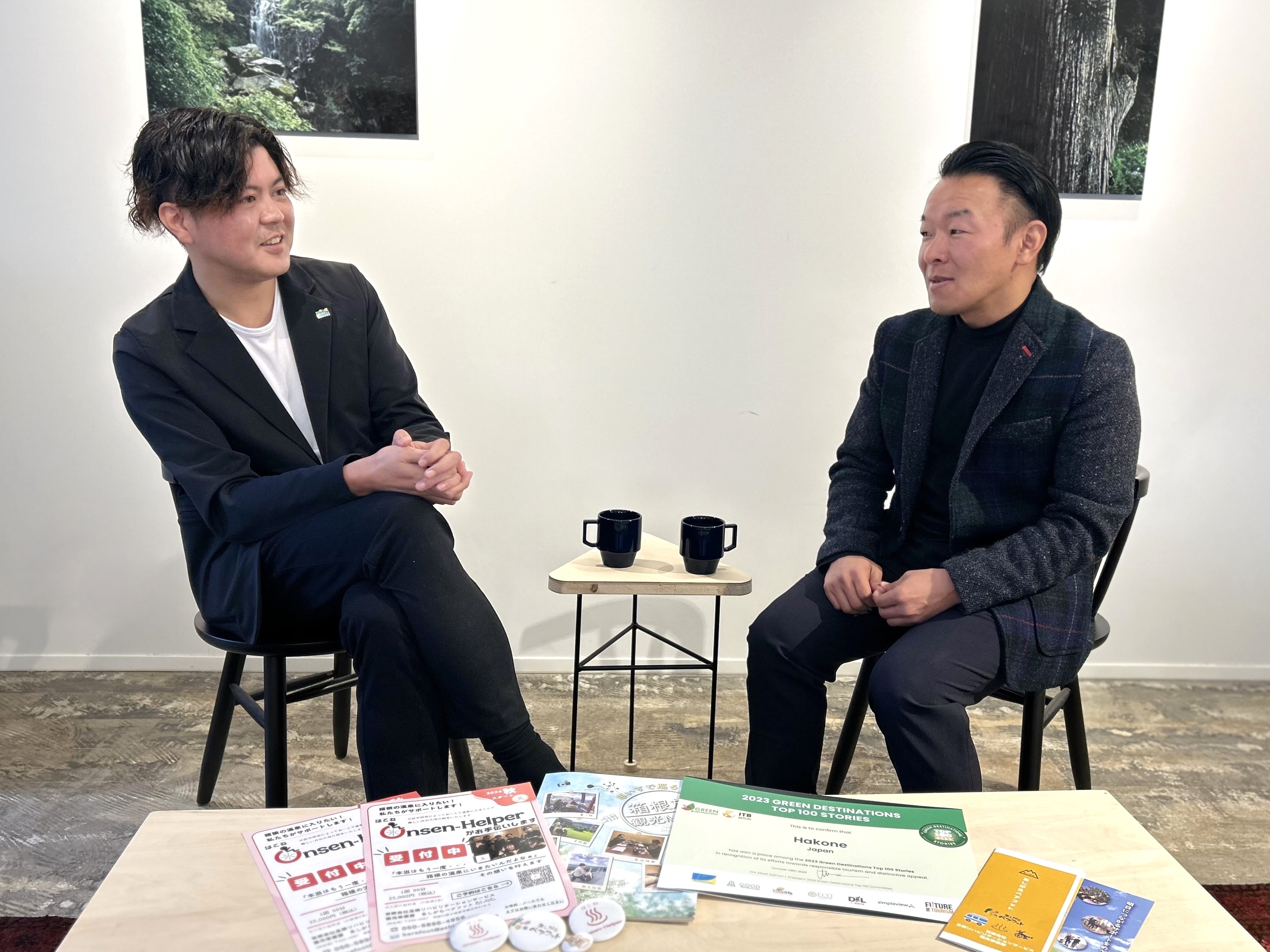 今回は、はこねOnsen-Helperの仕掛け人である有限会社足柄リハビリテーションサービス 観光事業部 あしがらベアフット 作業療法士の初鹿真樹さんと、箱根DMOの佐藤正毅が、プロジェクト発足の経緯や仕事の魅力、体験した感想などを語り合いました。