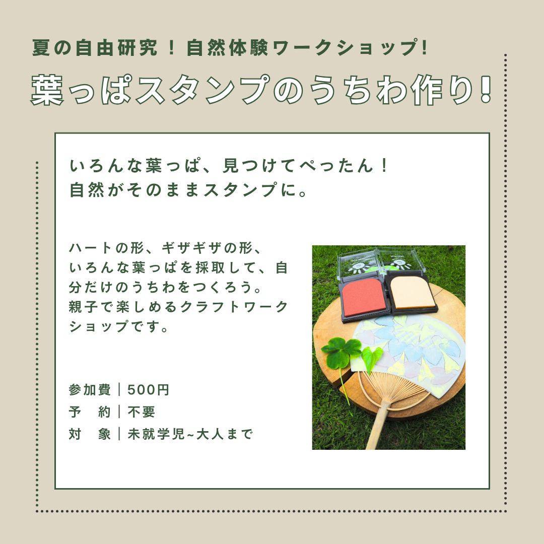 森で見つけた葉っぱをスタンプにして、自分だけのうちわをつくろう。