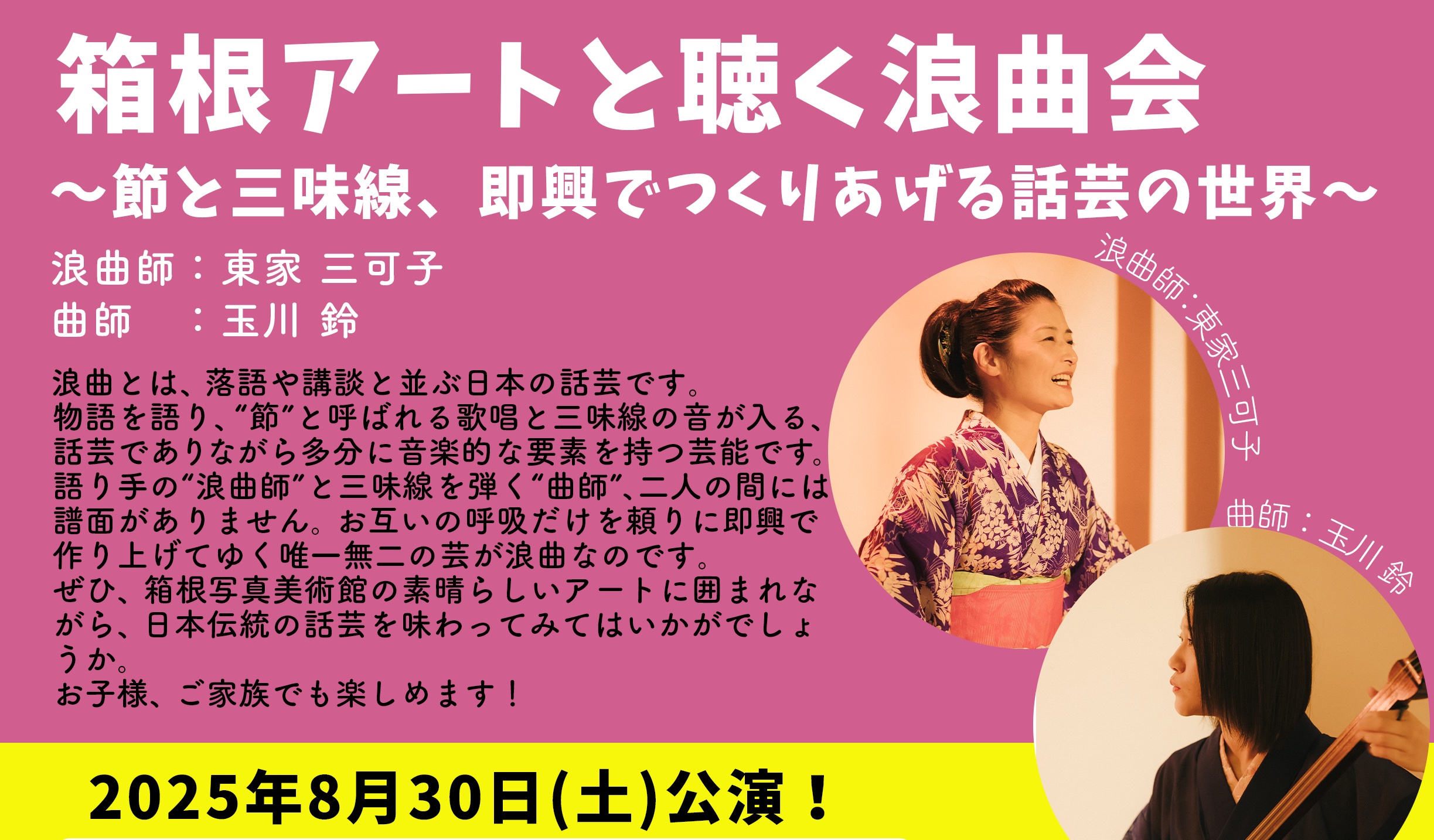 「浪曲」とは、「落語」や「講談」と並ぶ日本の話芸です。物語を語りながら、“節”と呼ばれる歌唱と三味線が入る、話芸でありながら音楽的な要素を持つ芸能です。また、語り手の“浪曲師”と三味線を弾く“曲師”、二人でやるのが浪曲です。浪曲師と曲師の間には譜面がありません。呼吸を読み即興で作り上げてゆく唯一無二の芸です。ぜひ、箱根写真美術館の素晴らしいアートに囲まれながら、聴きにいらしてください。お子様、ご家族でも楽しめます!