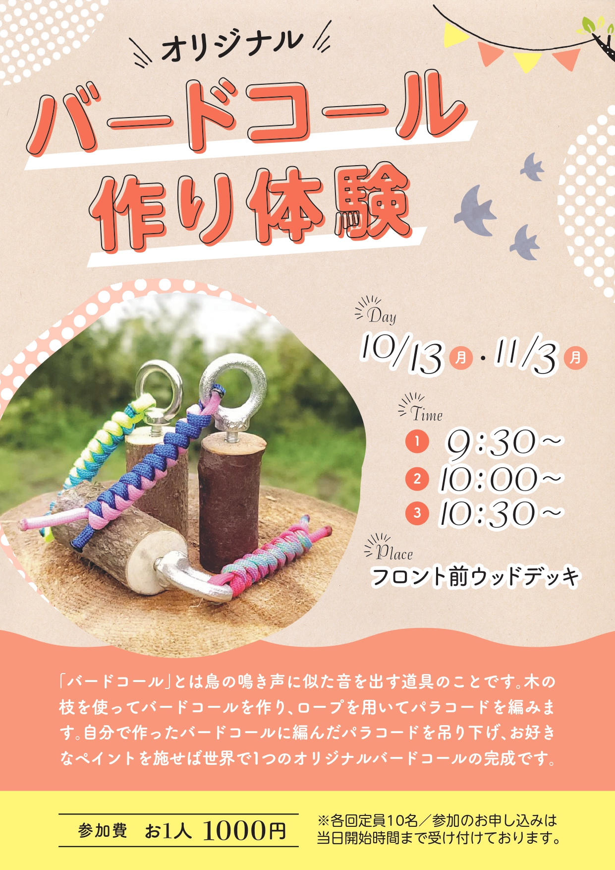 「バードコール」とは取りの鳴き声に似た音を出す道具のことです。木の枝を使ってバードコールを作り、ロープを用いてパラコードを編みます。自分で作ったバードコールに編んだパラコードを吊り下げ、お好きなペイントを施せば関あで1つのオリジナルバードコールの完成です。