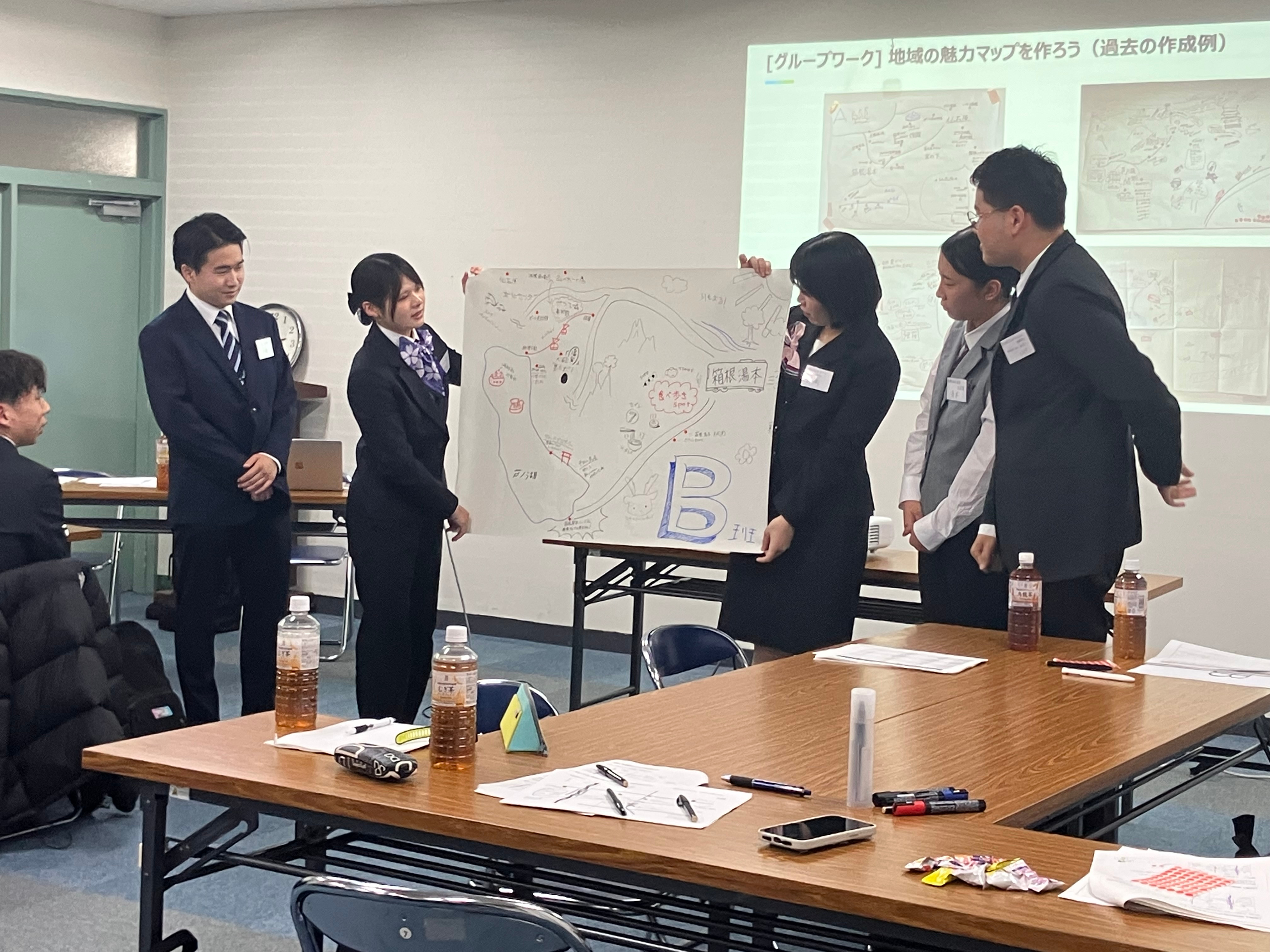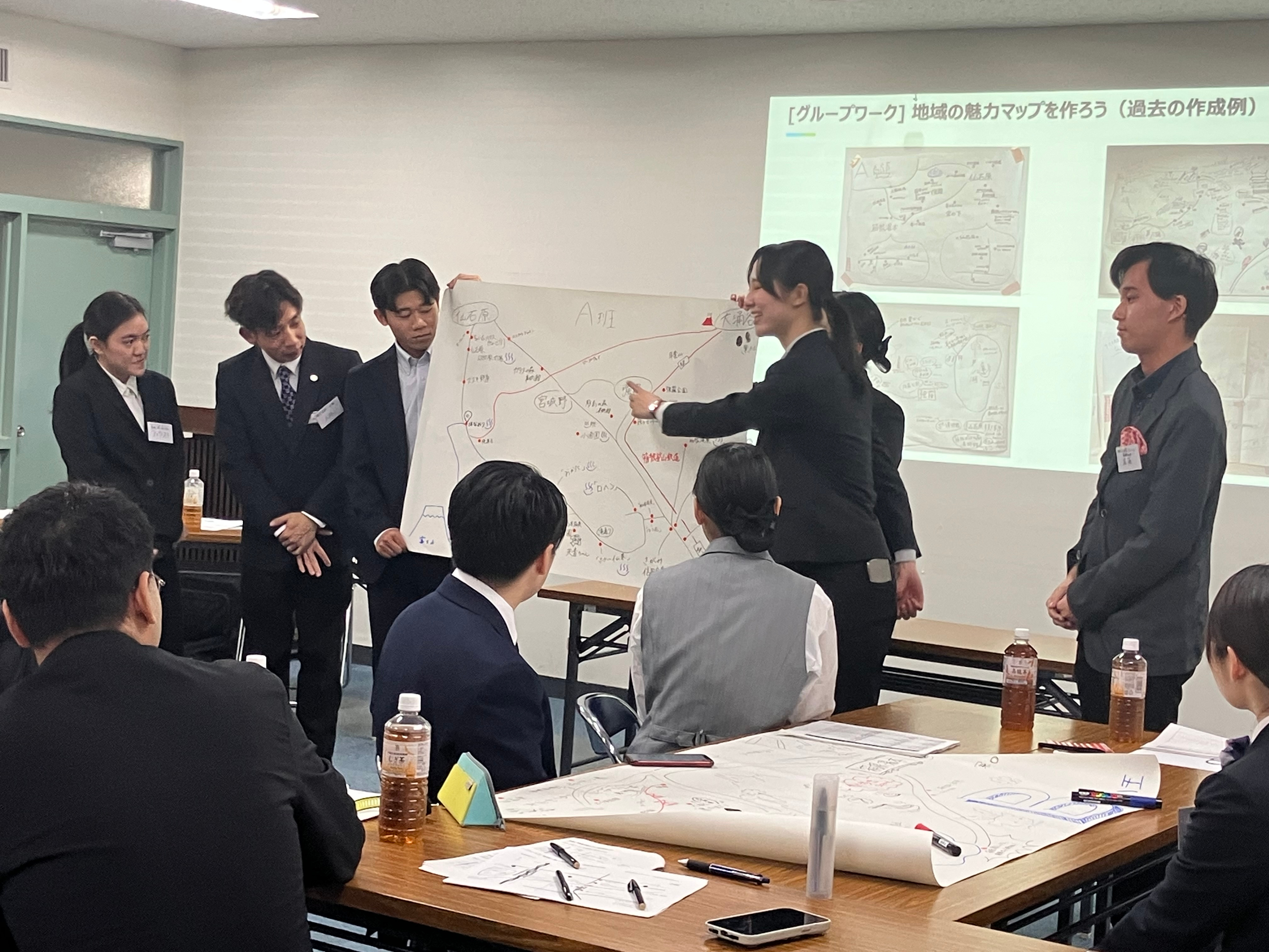 前半では、会社をシャッフルした6チームでグループワークを行い、箱根町の魅力をまとめたマップを作成。発表を通じて、地域の価値を多角的に捉え直す時間となりました。