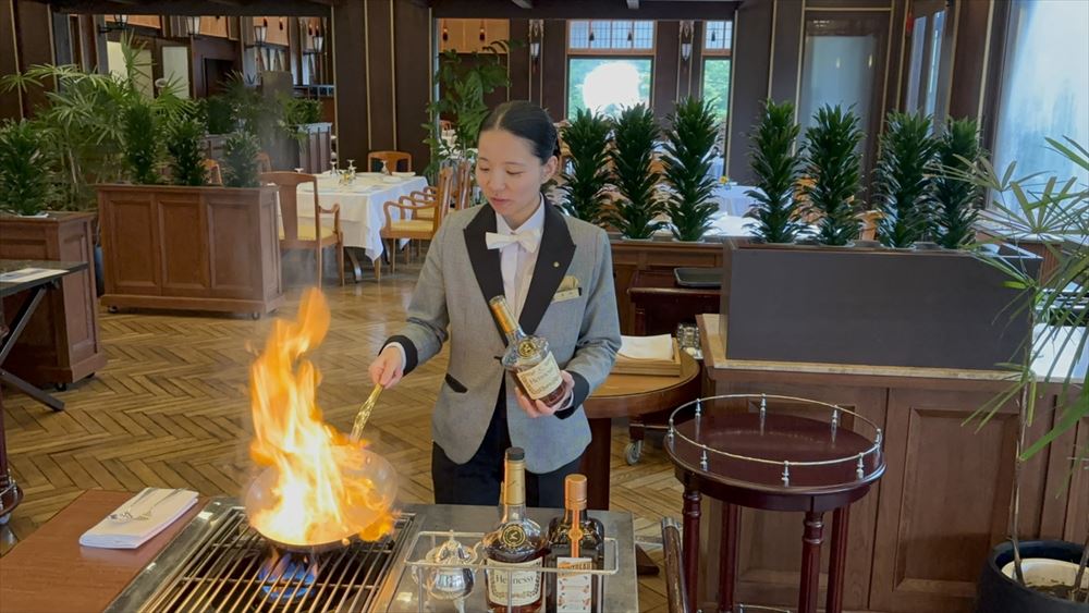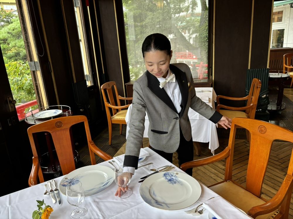 2021年に入社してからは、まず全体研修を受けました。その後、箱根・宮ノ下の配属になってからは料飲部だけの研修もあり、「お水のつぎ方」「ドレッシングのサービスの仕方」「左手サービスの仕方」などの練習も行いました。現在はレストランのホール担当として活躍しています。主な業務としてサービスを行いますが、お客様に出すグランドメニューの説明(料理長から料理の素材やこだわりを聞いて文章化する)やメンバーのシフト設計なども担当。これらの業務は、副主任、主任クラスが担当する業務ということもあり、責任も重いですが、やりがいが大きいですね。