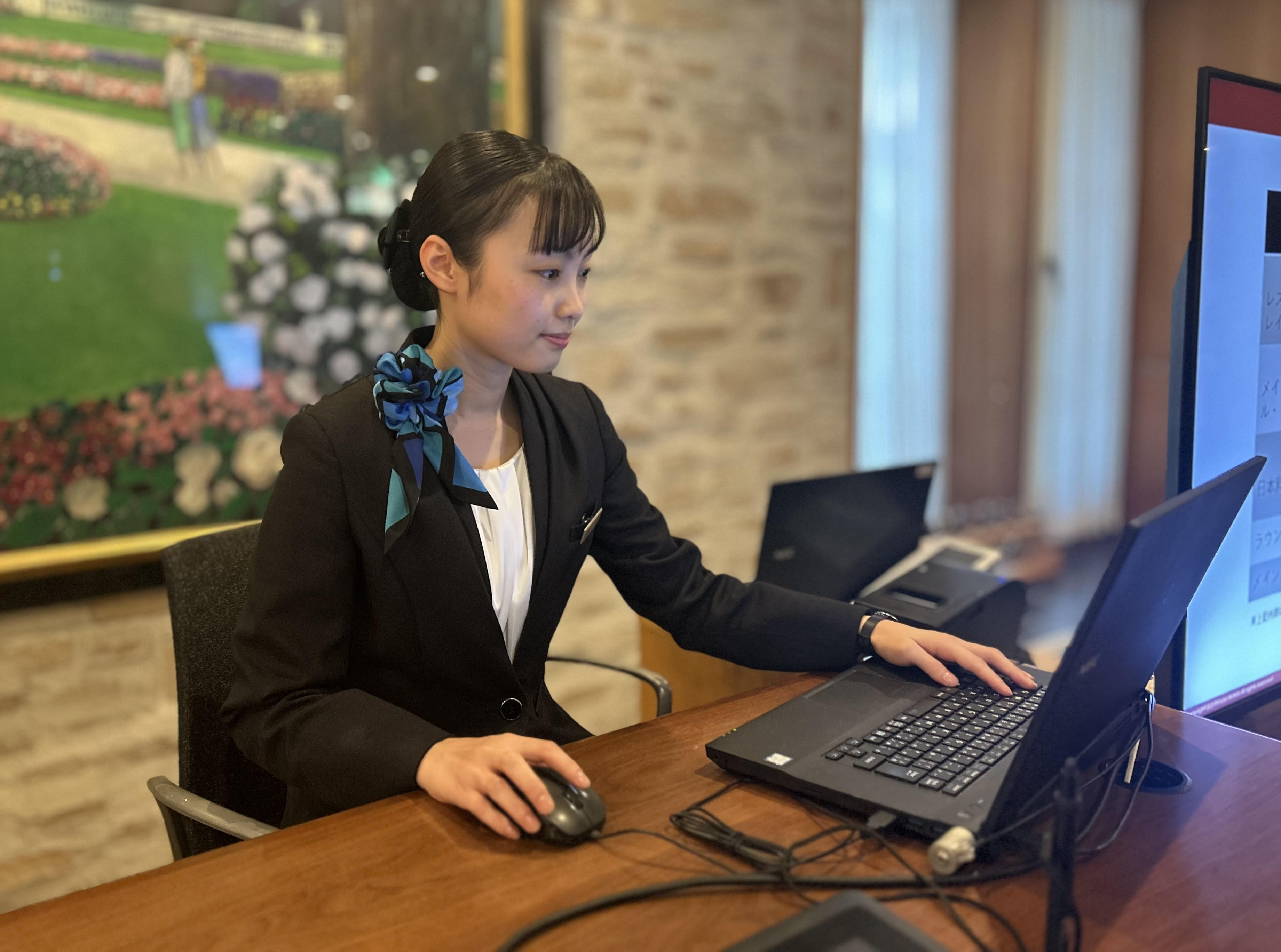 入社後1年は研修で、サービス部門や宿泊部門などを経験しました。現在は、自分の希望で、宿泊部門の中で、フロントとベルを担当しています。フロント業務は、お客様のチェックイン・チェックアウトのご対応を、ベルではお客様のお出迎えとお見送りをしています。