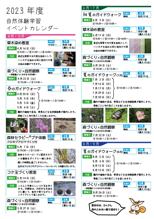 箱根やすらぎの森では、花や実、鳥、虫などを見ながら、自然や生きものについて楽しく学べる楽習教室(ガイドウォークや工作体験)やクイズラリー(自然のクイズ)、森林浴が楽しめます。
