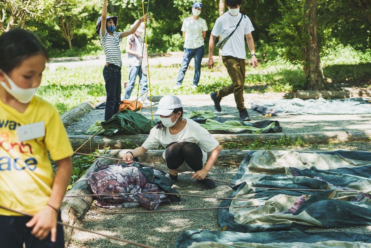 ゴールドウインが用意した、ザ・ノース・フェイスのテントが配られる。テントを手にした子どもたちは、思い思いの場所に秘密基地を作ってゆく。