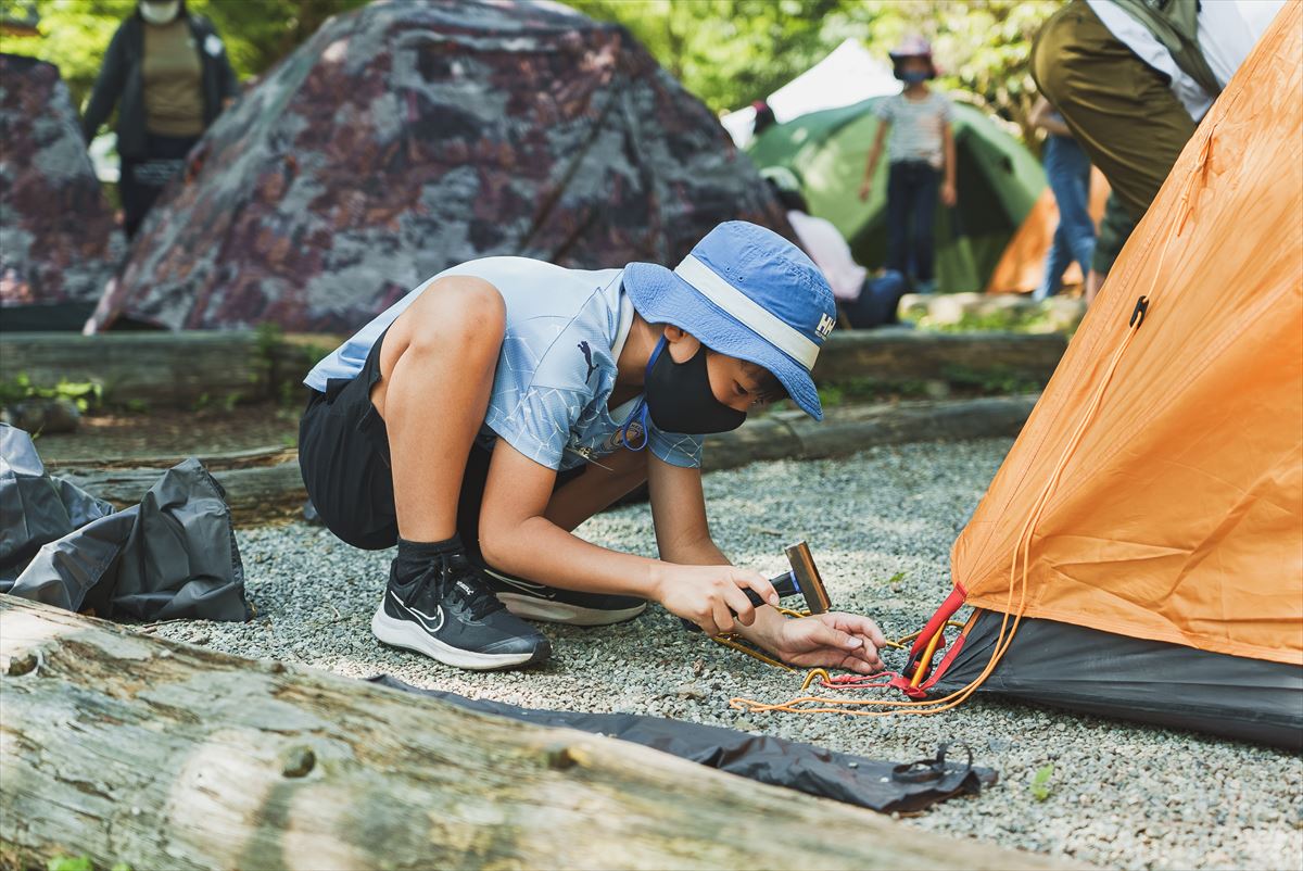 参加者には、これが初めてのキャンプという子もいた。通常のキャンプであれば、数人でひとつのテントに使うのだが、ご時勢もあり、今回は1人ひとつのテントに眠っている。