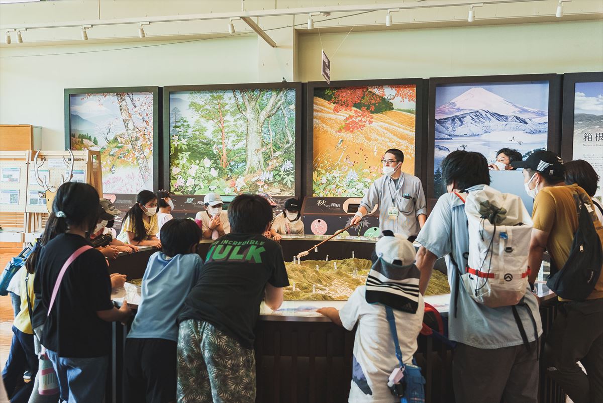 そうして生き物を探しながら箱根ビジターセンターに赴くと、主任の加藤和紀さんが立体模型を前に、箱根の不思議な地形とその成り立ちをていねいに解説してくれた。