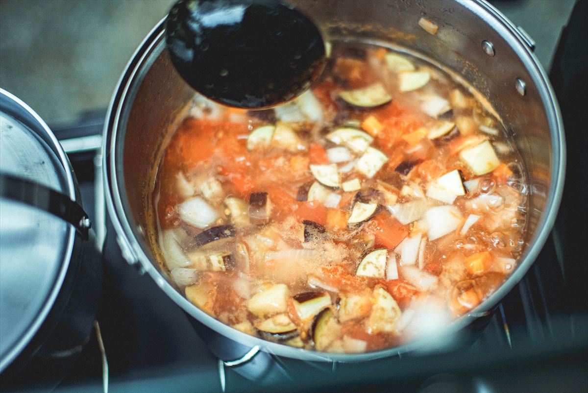 キャンプに戻ると夕焼け空の下、お待ちかねのカレー作り。キャンプリーダーから材料を受け取った子どもたちは、3つの班に分かれて調理をはじめる。レタスやトマト、ニンジンやタマネギ、ナスなど食材を使ってカレーとサラダを作るのだが、作り方や材料の配分は彼らに任されている。ちょっぴり不安そうに顔を見合わせる子どもたちの姿に、豪太さんはガハハと笑いかける。