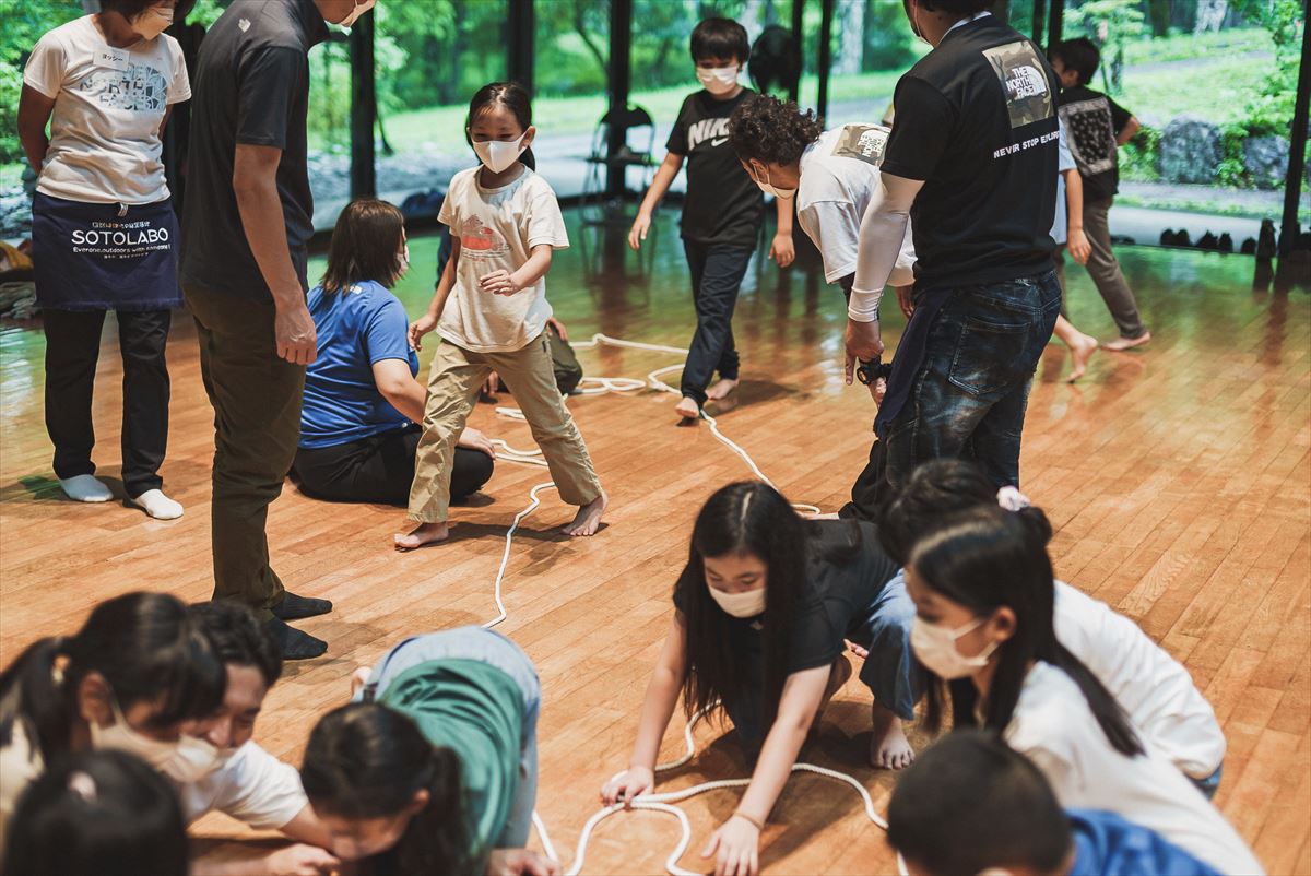 午後の大涌谷への散策も中止となり、急遽、昨晩ガイドしてくれた筑紫先生がやってきて、大きなロープを作った日本地図づくりのゲームと、ランタンづくりを指導してくれた。このころになると、初めて出会ったはずの子どもたちは、昔からの友だちのように打ち解けており、小さな友だちをフォローするような空気ができあがっていた。スタッフは子どもたちの様子を見守りながら、天気予報とにらめっこが続く……。