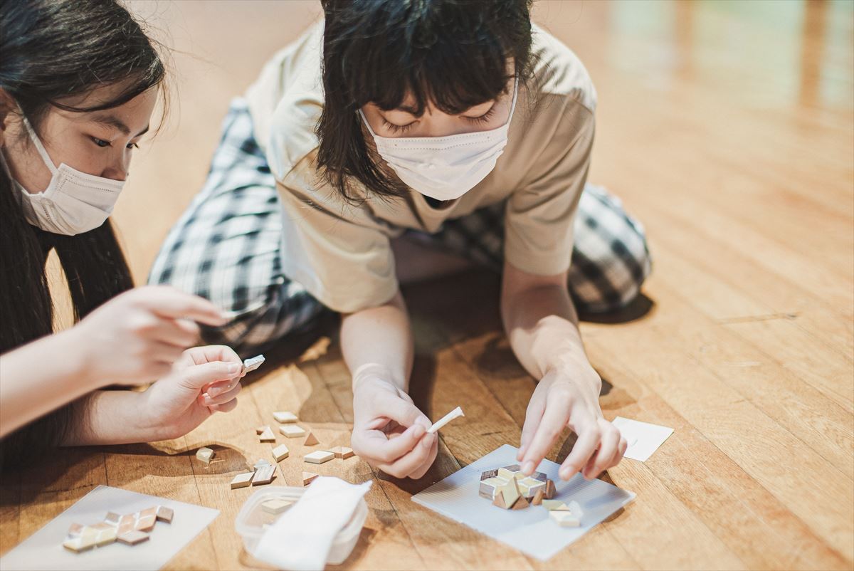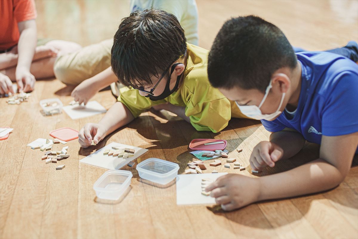 リーダーの拍手に合わせ、子どもたちは両手をパン。そうして2回手を叩けば2人組、4回叩けば4人組を作り、互いに「こんにちは!」。今度はグループをひとつながりの列車に見立て、別の列車とじゃんけん。負けたほうが列車の後ろにつながって、さらにじゃんけん。それを繰り返すことで、ひとつの大きな輪ができた。そうして円が笑いに包まれてゆくと、緊張気味だった空気がほどけてゆく。15分前に出会ったばかりの子どもたち同士は、にこやかに打ち解けていった。