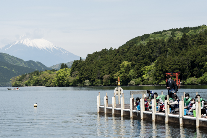晴れわたる空の下、ぽっかり浮かぶ富士山と新緑が織りなす錦絵のような森に包まれた芦ノ湖。広い湖を恐る恐る泳ぐ小魚たちは、新しい世界へと踏み出した子どもたちの姿と重なった。