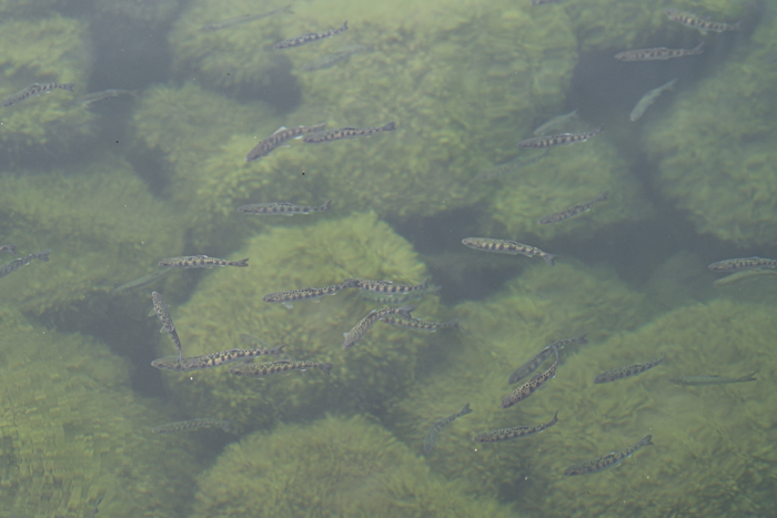 初めての水面に戸惑うのか、湖に放たれた稚魚はしばし浅瀬にとどまる
