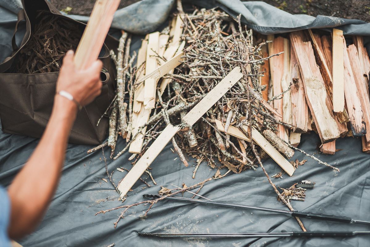 薪は太さの違うものをそろえておき、細かいものから順に火を着けていく