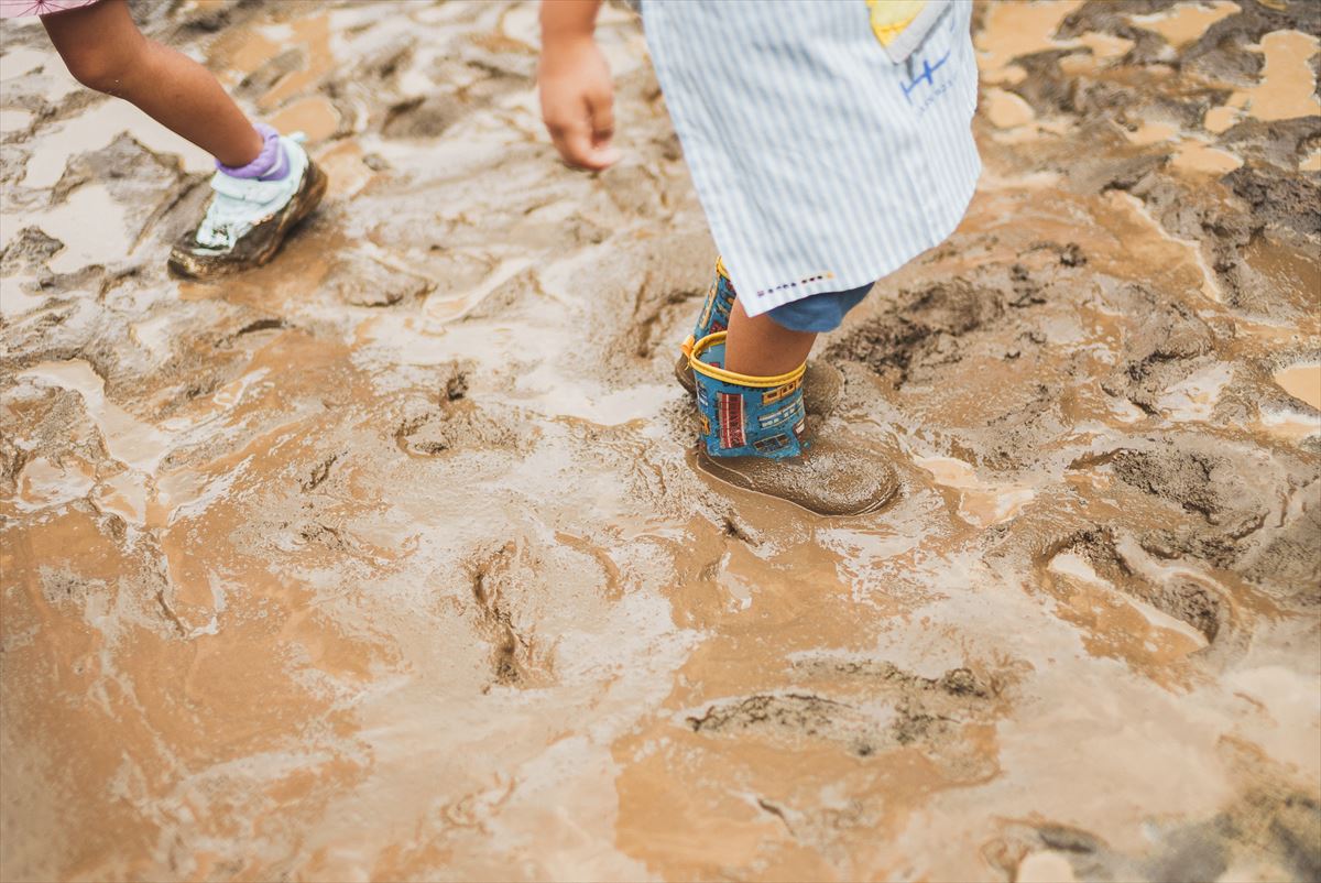 雨あがりの園庭に広がる、焚き火と泥の匂い。園庭で焚き火ができる、素晴らしい環境