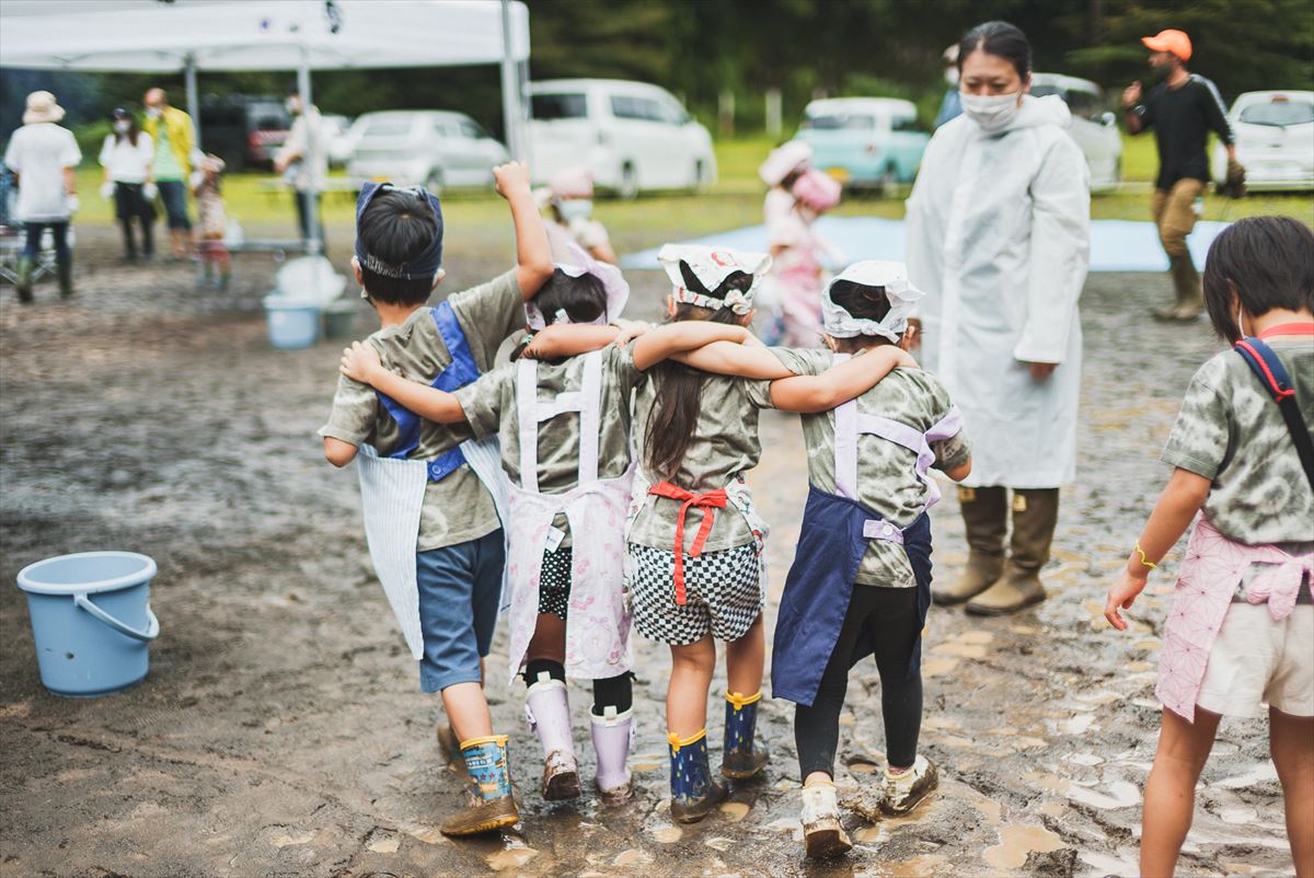 雨あがりの匂いが立ちのぼる広い園庭は、はち切れんばかりの期待感にあふれていた。この日を待ちわびていたのか、種が弾けるようにひとりが駆け出すと他の子が続いてゆく。そうして、水たまりの残る園庭はたちまち泥んこに! ところが、先生方や集まった保護者には咎める様子がない。そこには包みこむようなおおらかさと、彼らとのたしかな信頼感が漂っていた。そうして一段落すると、箱根幼稚園の金井潤子先生が声をかけた。