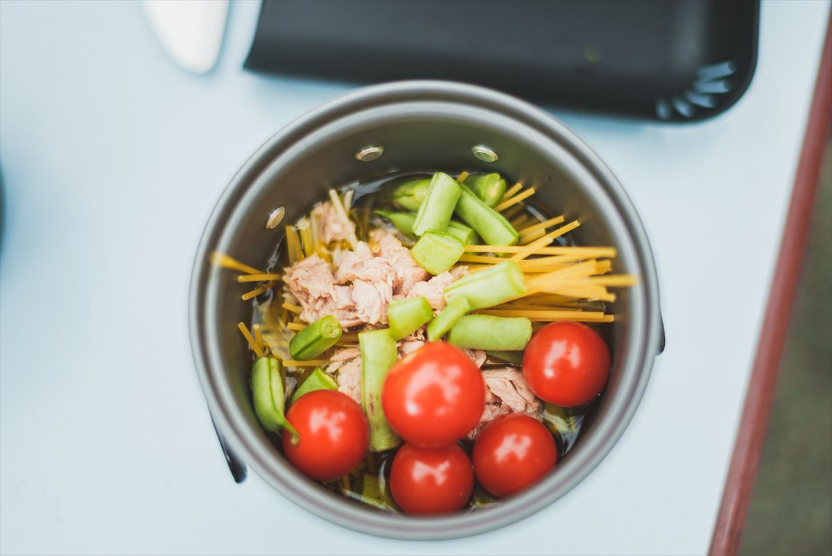 「パスタはソースは と分けて調理したほうがもちろんおいしいけれど、アメリカ的な合理性というのかな、鍋ひとつで完結するおもしろさがある。子どもにも親しみやすいし、茹で汁を捨てずに調理するので、登山にもぴったり。ソースを煮詰めてもいいし、スープパスタ的に食べてもおいしい。ナスやバジルを入れてもいいですよ」