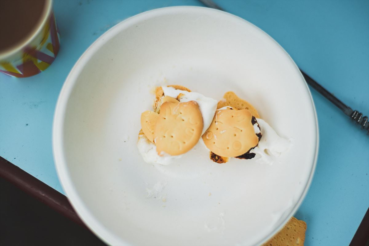 午後は、マシュマロを焼いてビスケットで挟んだお菓子、スモアを作った。焚き火で炙るのは、シンプルな分だけ、難しいところがある。少し目を離すと焦げついたり、とろりと溶けて落っことしたり……。塊肉や釣り上げた岩魚をを 炙るのも、簡単なようでじつは奥深くおもしろい。そんな魅力に気づいたのだろうか、3つのマシュマロを刺し、焼き加減を見ながらくるくると回す男の子の姿に、小雀さんは目を細めた。