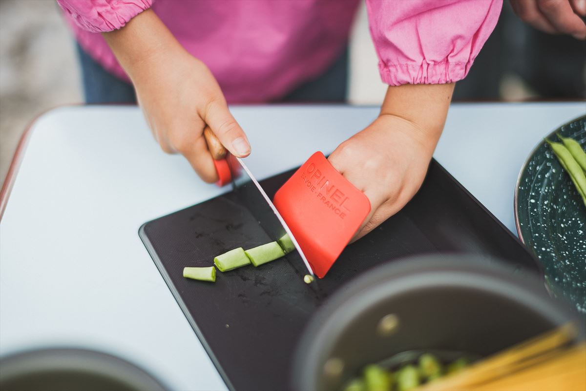 そうして、この日のメニュー、ワンポットパスタの準備に取りかかった。ワンポットパスタとは、アメリカで人気のキャンプメニュー。200mlほどの水にオリーブオイル少々、パスタとツナをあらかじめ入れたポット(鍋)を焚き火上に置き、じわじわと加熱してゆくシンプルな料理だ。小雀さんは、ひとりにひとつ用意された鍋と指を通すガイドのついたナイフ、手指を守るプロテクターを配った。