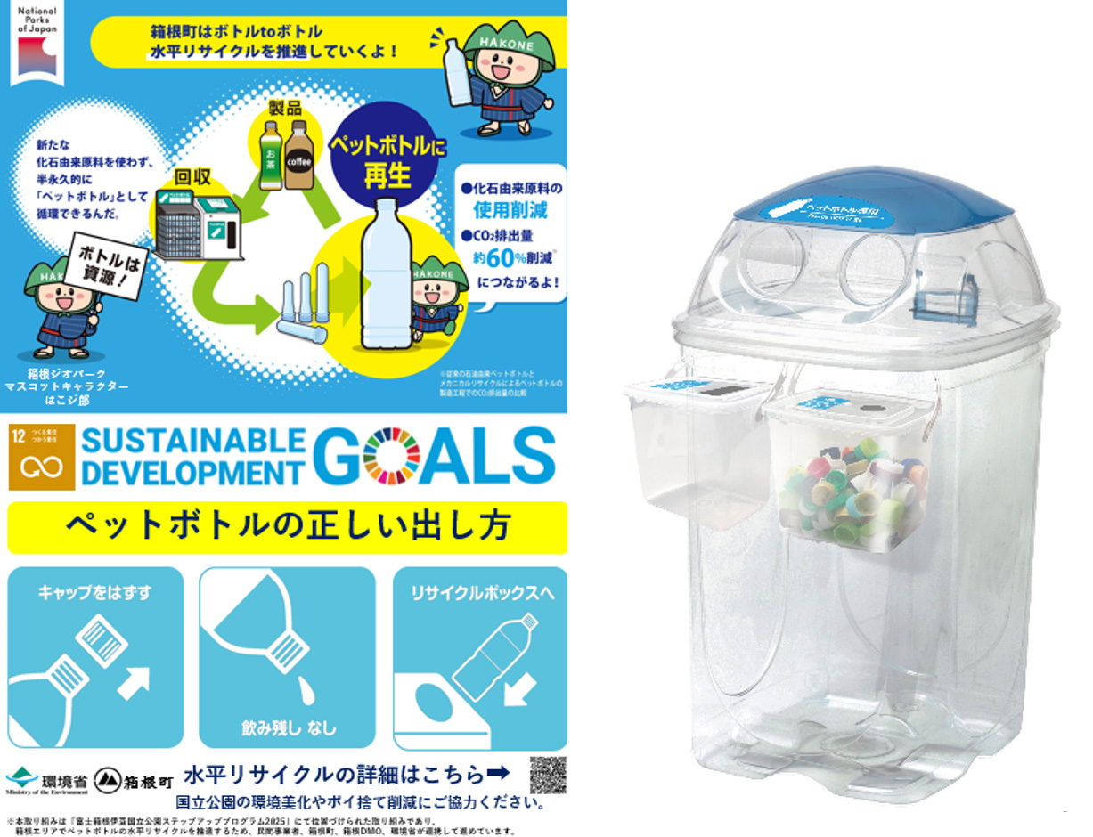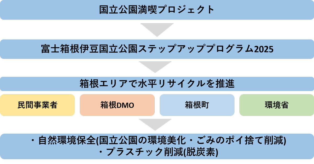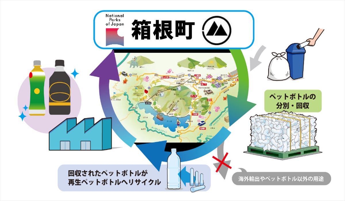 箱根町は自然、歴史、豊富な温泉に恵まれた国際観光地でありながら、首都圏から最も近い国立公園でもあります。環境省は世界水準の「ナショナルパーク」として国立公園をブランド化するために「国立公園満喫プロジェクト」を推進し、「富士箱根伊豆国立公園ステップアッププログラム2025」を策定して箱根エリアでのペットボトルの水平リサイクルを、民間事業者、箱根町、箱根DMO(一般財団法人 箱根町観光協会)と連携して進めています。