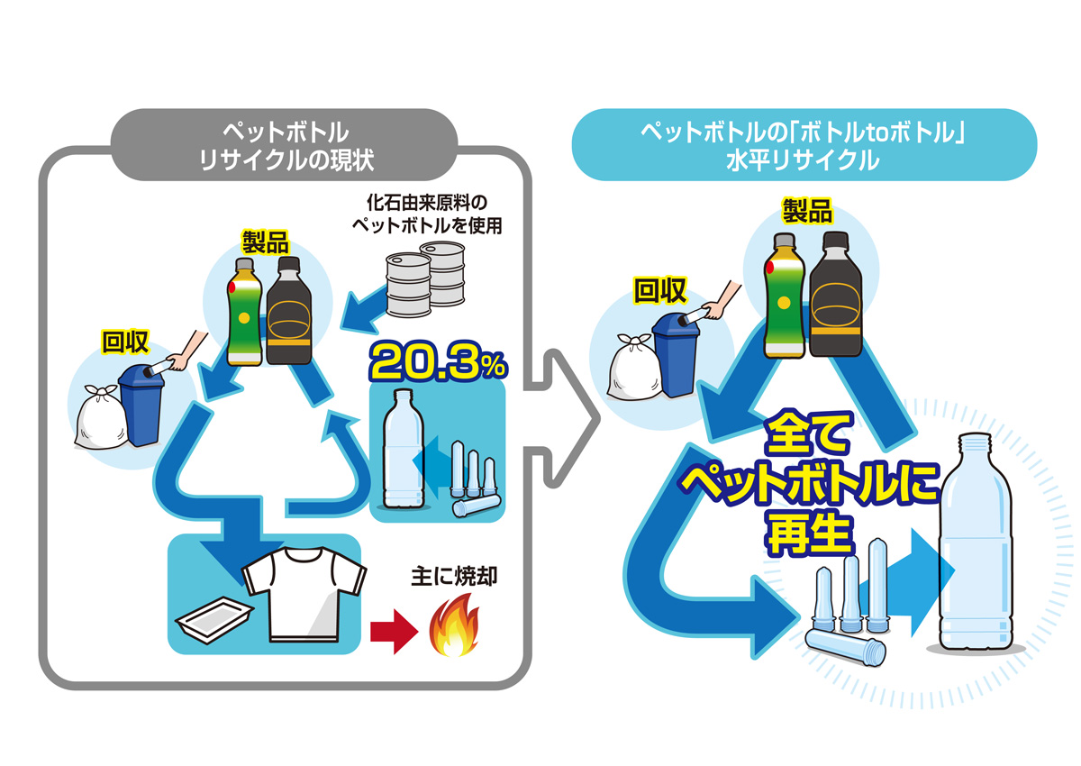 日本では使用済みペットボトルの約94%が回収され、リサイクル率は約86%と欧米に比べ非常に高い水準にありますが、多くはトレイ、繊維などにリサイクルされることにより、使用後は焼却され、そこでリサイクルの輪が終了してしまいます。新たなペットボトルにリサイクルされてずっと使い続けられる「ボトルtoボトル」水平リサイクルの割合はまだ20.3%なので、さらに高めていく必要があります。そのためには、キャップ・ラベルを取り外して、中身がきれいな状態で分別することが大切です。