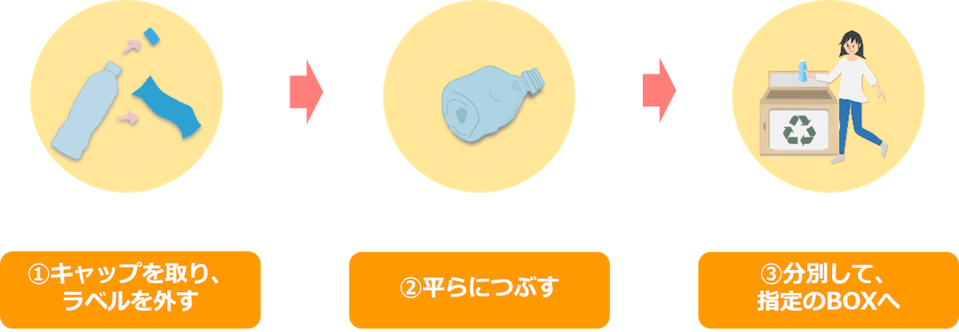 正しい出し方が伝わるようオリジナルポップを作成して啓発を行うと共に、「キャップ」「ラベル」「これらを取り除いたペットボトル」に分別ができ、ペットボトルの状態が外から見える「透明リサイクルボックス」を作成し、町内の事業者の方々などによる拠点回収を促進し、使用済みペットボトルの品質の確保を図りつつ回収量の増加を目指しています。※現在は、一般家庭分も含めた使用済みペットボトルのすべてを水平リサイクルしています。