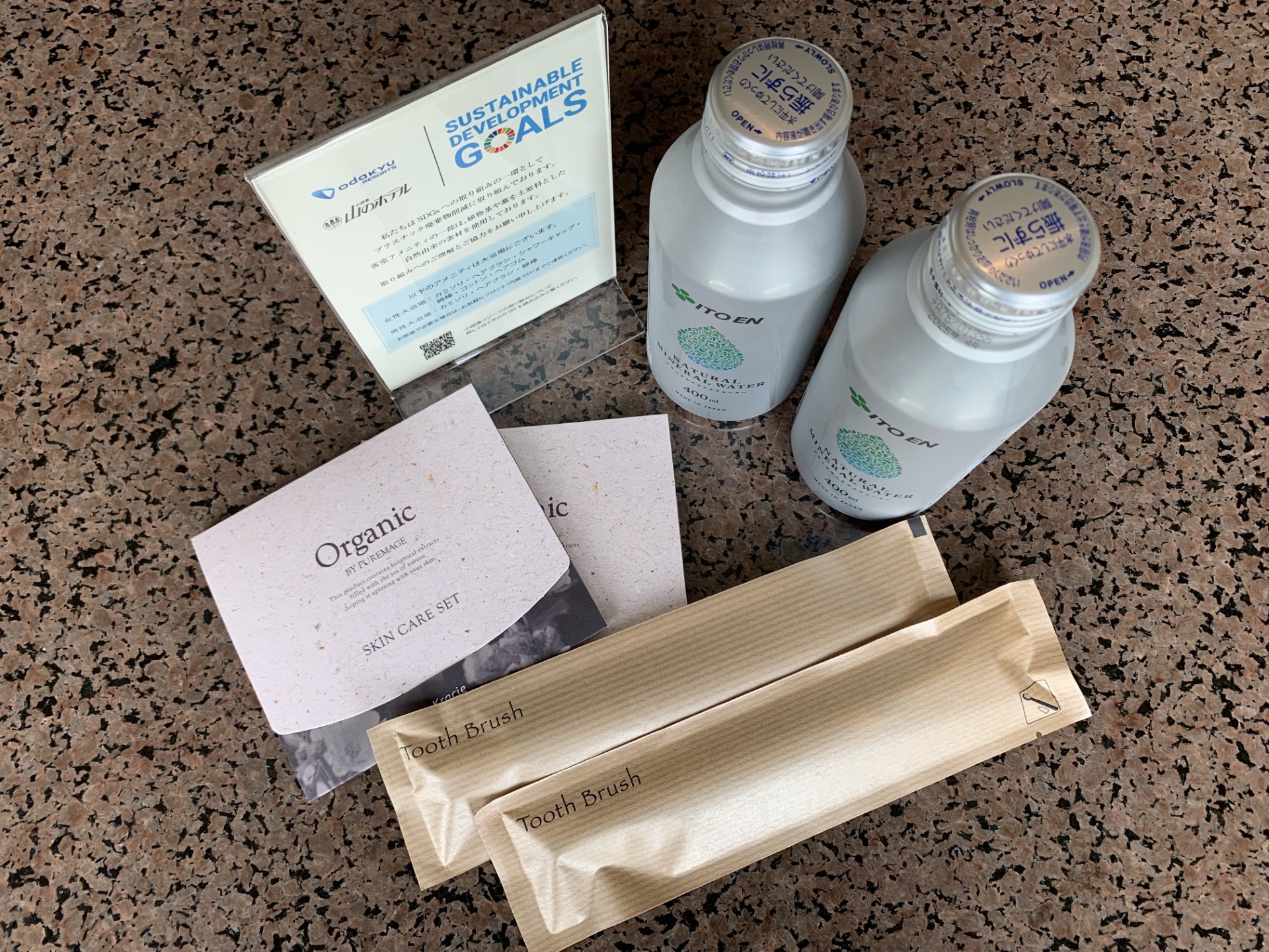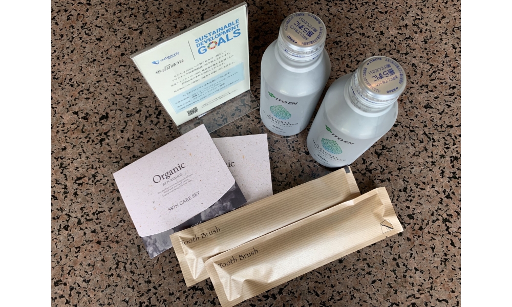 アメニティ類をプラスチック包装の物から紙製の物へと切り替えペットボトルのミネラルウォーターをよりリサイクルし易いアルミ製の製品に切り替え