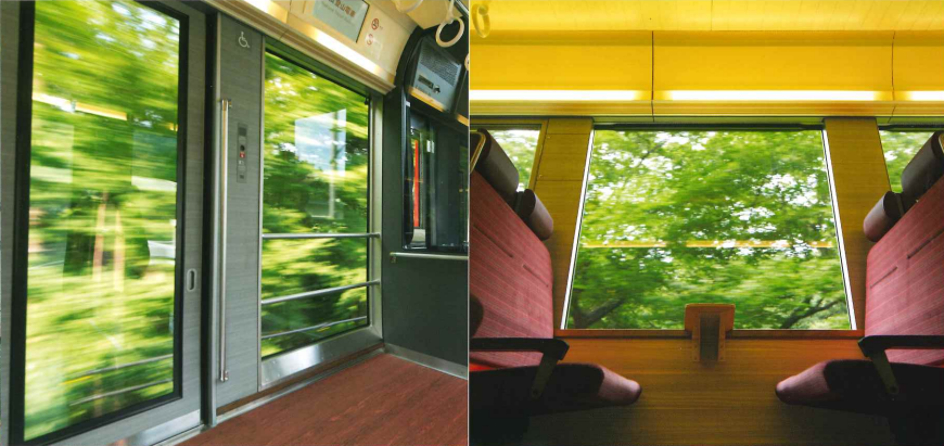 デザインは小田急ロマンスカーVSE、MSE、GSEなども手がけた『岡部憲明アーキテクチャーネットワーク』の手によるもので、箱根の山の中を走る特徴を活かし、雄大な自然を間近に体感できるよう、従来の登山電車の車両よりも大きな窓ガラスを採用。出山の鉄橋からのぞく渓谷や、山間に見え隠れする相模湾、かなたに見える箱根外輪山など…季節により表情を変える箱根の風景を存分に楽しめるよう設計されました。