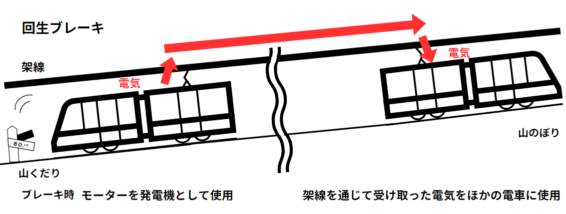 ブレーキ時にモーターを発電機として使用し、この際の運動エネルギーを電気エネルギーに変換します。ここで発生した電力は、電車の架線に戻され、ほかの走行中の電車に使用することで、消費電力の削減に大きく貢献することができます。