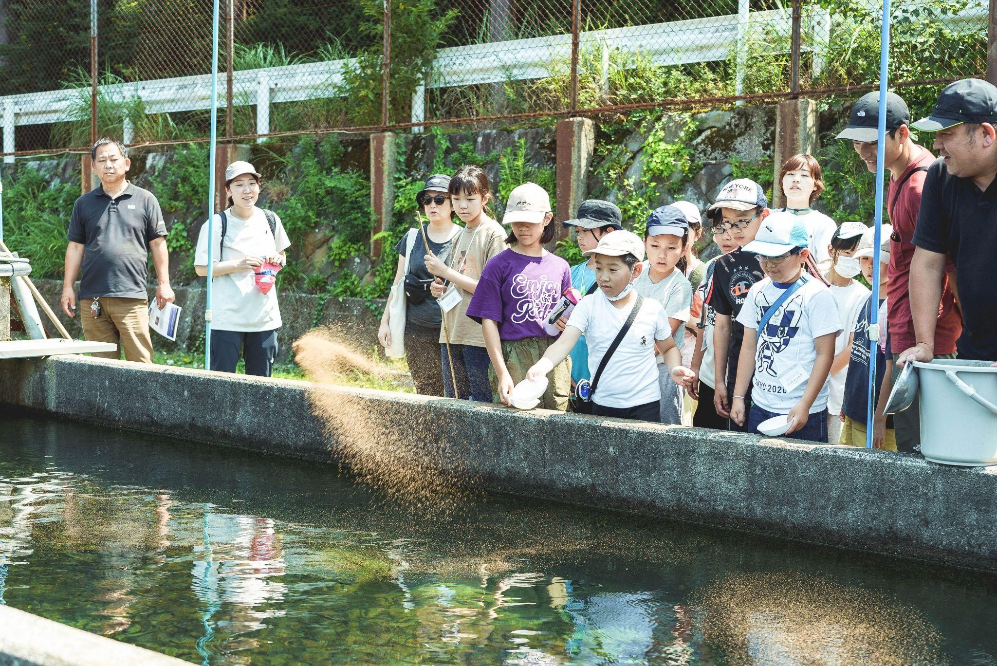 漁協の結城陽介さんが子どもたちに声をかける。おもしろいのは、魚種によって性格が異なること。子どもたちが近寄ると逃げてしまうサクラマス(ヤマメ)は、いつも餌をあげている結城さんの姿を追うように移動する。