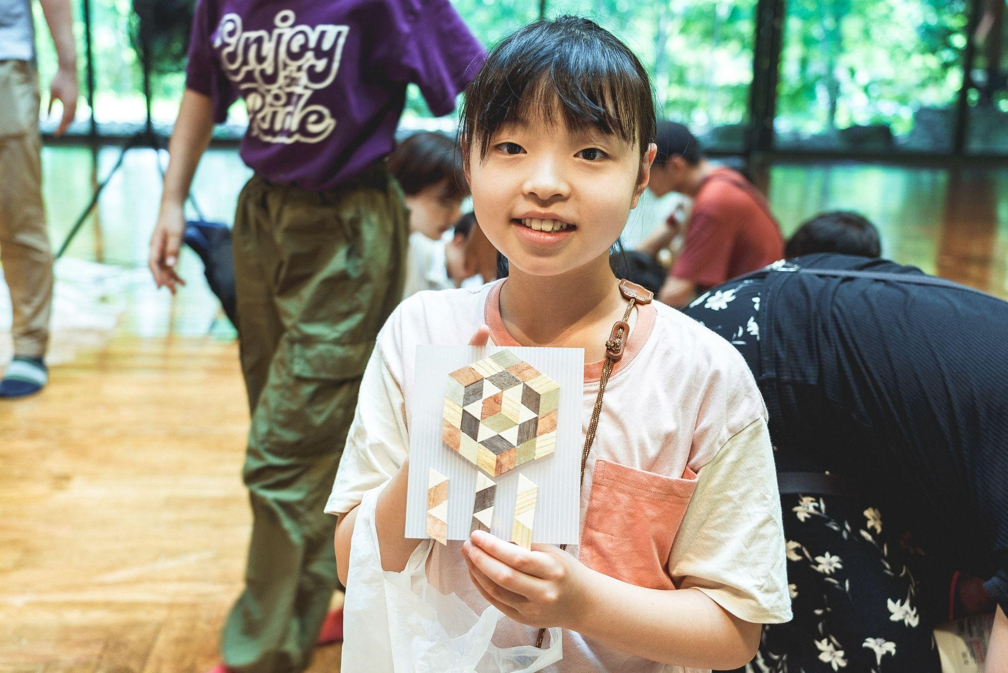 最後のプログラムである、箱根伝統の寄木細工教室。色とりどりの素材を合わせて試行錯誤。家族のお土産をつくる子も
