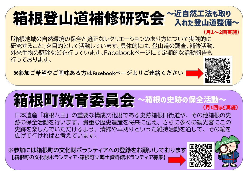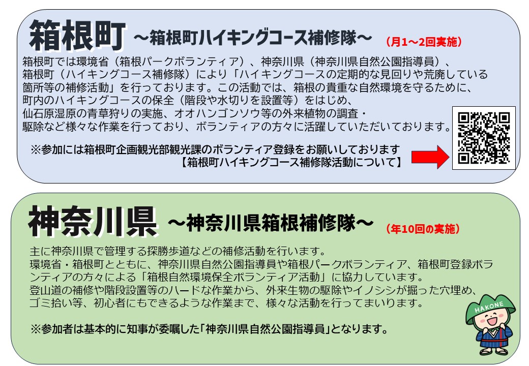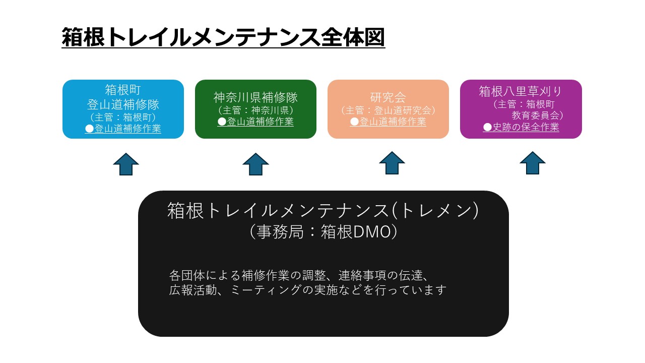 | ◆トレメン協力メンバー◆ | 箱根町観光課/教育委員会 神奈川県自然環境保全センター箱根出張所 一般財団法人 自然公園財団 小田急電鉄株式会社 株式会社ゴールドウイン 株式会社やまぼうし 箱根DMO(一般財団法人 箱根町観光協会) |