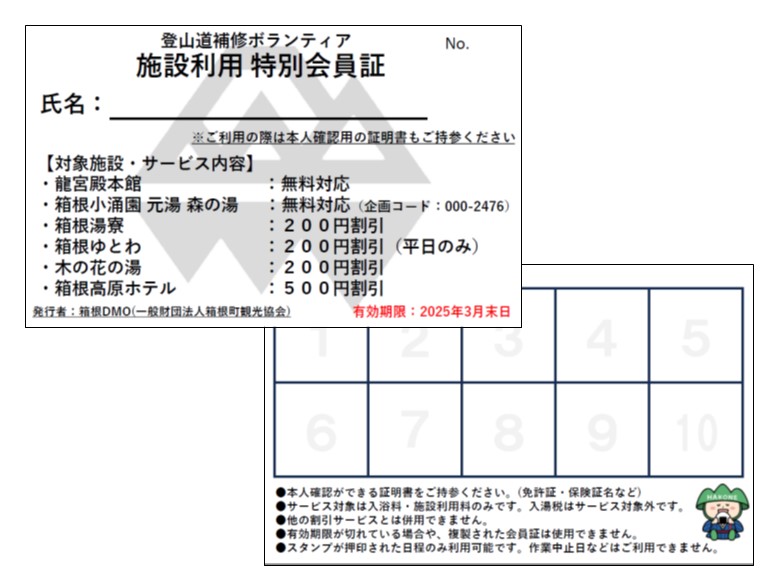 作業に参加していただいた方には【特別会員証】を発行し、活動に参加した日は押印をすることで、協力施設にて入浴無料・割引などのサービスを受ける事が可能です。