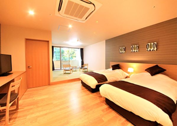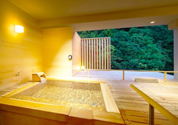 段差の少ない半露天檜風呂付の客室で寛ぎの時間を堪能出来ます。