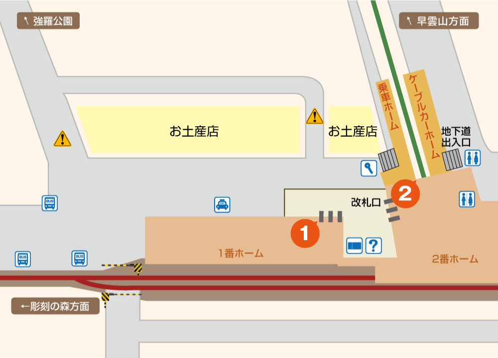箱根登山鉄道強羅駅構内に車いすをご利用の方が利用できるトイレが設置されています。強羅駅を降りてすぐのお土産屋さんは車いすをご利用の方も中に入る事が出来ます。駅前は比較的穏やかですが、少し外れると傾斜や階段がありバリアが存在します。