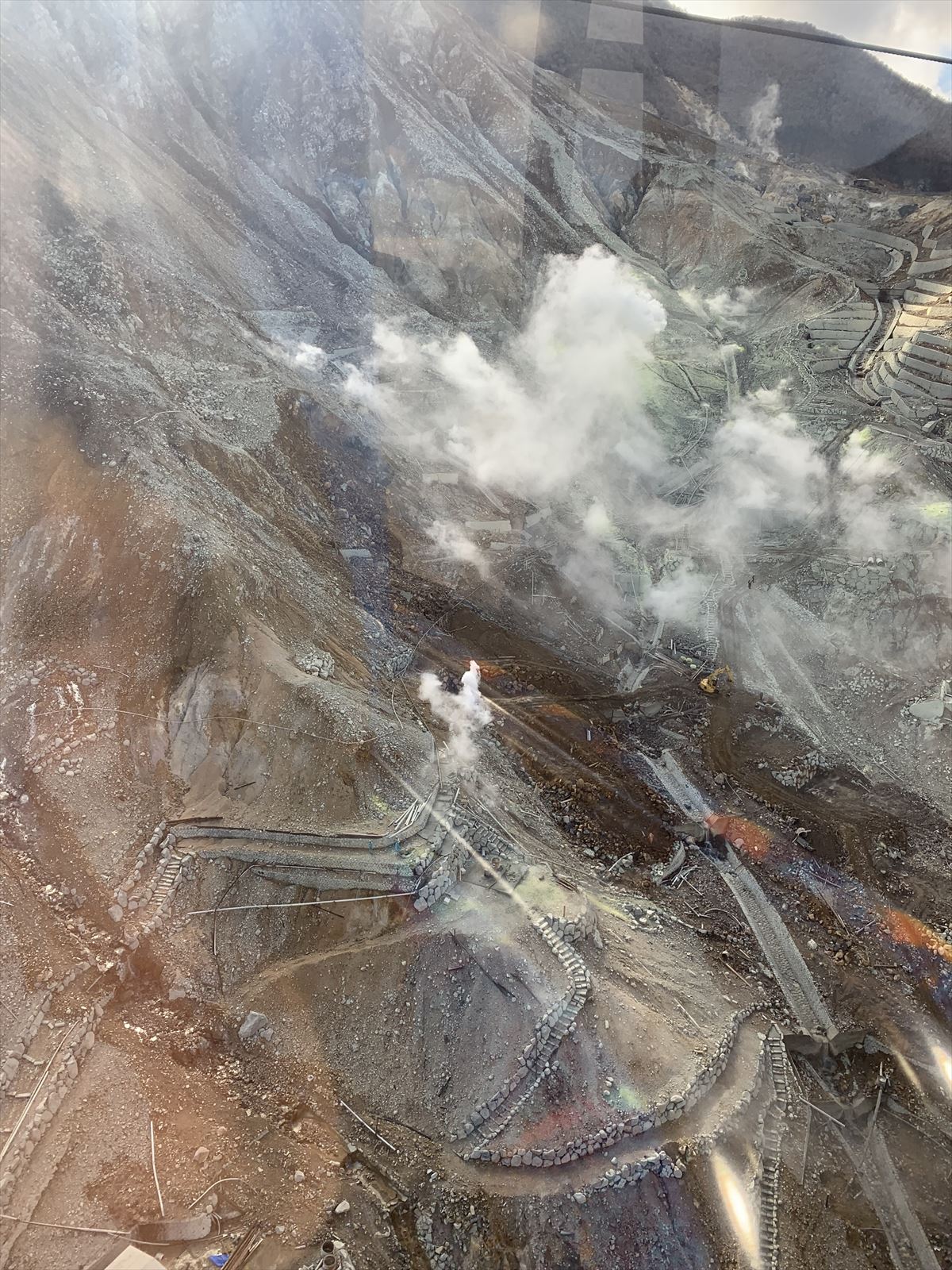 ロープウェイが一番高い所まで行ったら絶好の撮影スポット!ダイナミックな大涌谷が眼下に広がります。スリル満点な景色をお楽しみください。( あまりの高さに手汗が止まりません、、、)