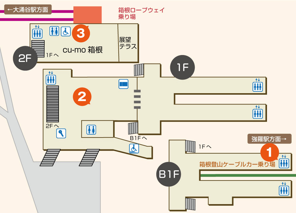 早雲山駅周辺は基本的に坂が多く、車いすでの移動には適していません。しかし早雲山駅はロープウェイへの乗り継ぎを行う駅となっており、駅構内はバリアフリーとなっております。車いすをご利用の方が利用できるトイレは2か所御座います。また喫煙所が駅構外に設置されており車いすで行く事も可能です。
