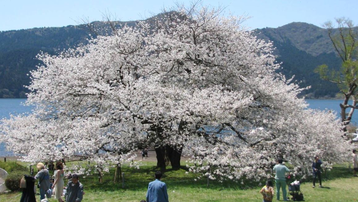 水族館の先に見えてくる大島桜は「湖畔の一本桜」といわれ箱根園の春のシンボルとなってます。この大島桜は枝張り2 3m高さ12mの富士山型をした桜で、毎年4月中旬から下旬、ゴールデンウイークにも咲かせている年もある遅咲きの桜です。