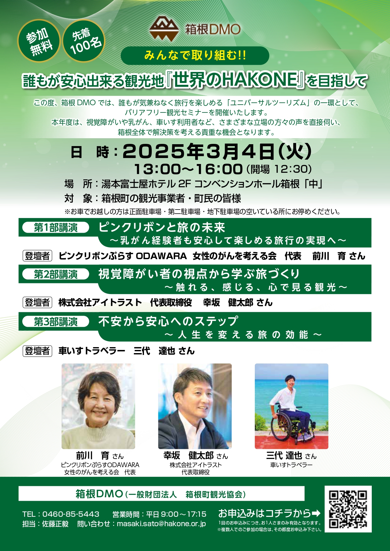 この度、箱根DMOでは、誰もが気兼ねなく旅行を楽しめる「ユニバーサルツーリズム」の一環として、バリアフリー観光セミナーを開催いたします。
