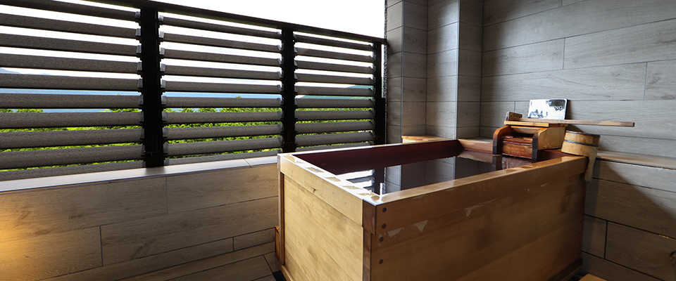 全ての客室半露天風呂から、大自然の景色をお楽しみいただける構造になっており、中でも富士山や外輪山眺望の半露天風呂から眺める富士山や外輪山はとても美しく、森側からの眺望も、いつまでも眺めていたくなるほどです。